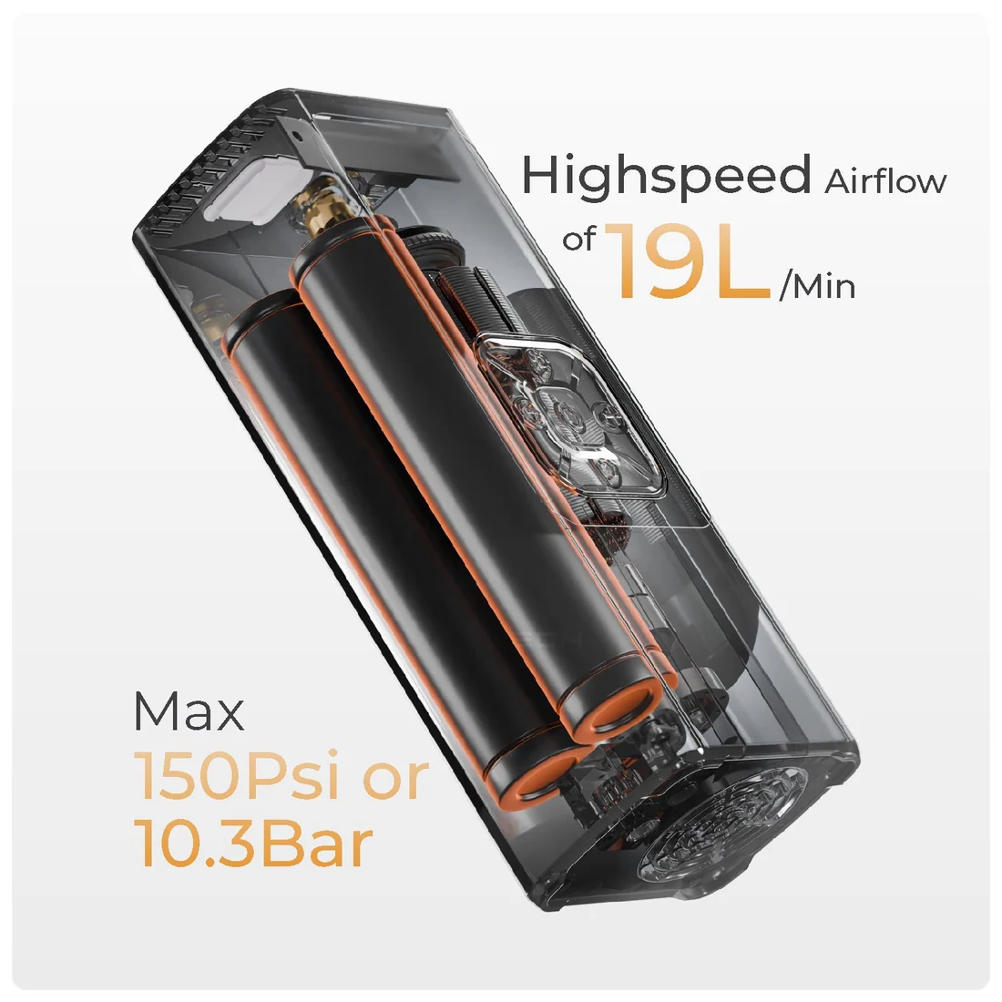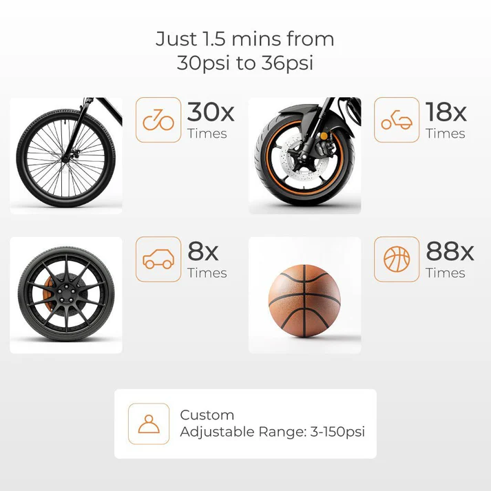 - Super Fast Inflation – Maximum pressure of 150 PSI for car tires, bicycles, and inflatables