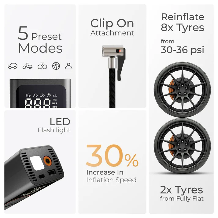 The XECH Inflate XL is the ultimate tyre inflator for car, bike, and motorcycle needs. This portable cordless inflator offers super-fast inflation with a digital display for precise air pressure control.