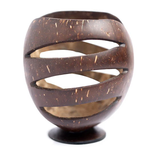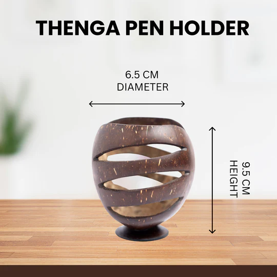 Thenga Coconut Shell Pen Holder/Stand, an eco-friendly and stylish addition to your desk, home, or office. Handcrafted from natural coconut shell and wood, each pen holder showcases the unique textures and grains of the coconut shell, adding a touch of rustic elegance to any workspace. This pen holder is perfect for organizing your pens, pencils, and other small office supplies, making it both functional and decorative. Embrace sustainability and craftsmanship with this unique pen holder.