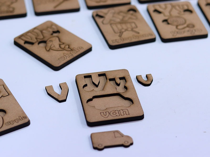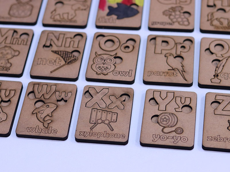 Complete A–Z Set: 26 wooden tiles with uppercase, lowercase, and matching image-word engraving.